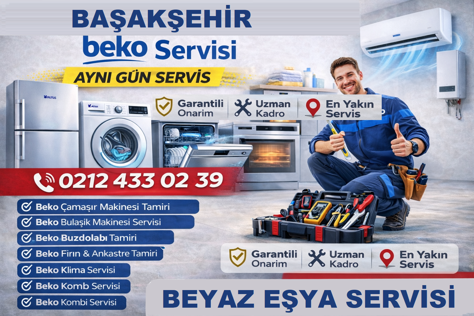 Evlerimizde yaşam kalitemizi artıran Beko beyaz eşyalar, yoğun kullanım veya teknik sebeplerle zaman zaman arıza yapabilir. Başakşehir Beko Servisi olarak, bölgedeki tüm mahalle ve sitelere (Kayaşehir, Bahçeşehir, Güvercintepe, Şahintepe dâhil) uzman kadromuzla hizmet taşıyoruz. 0212 433 02 39 numaralı çağrı merkezimizden bize ulaşarak arıza kaydı oluşturabilir, aynı gün servis avantajından yararlanabilirsiniz.